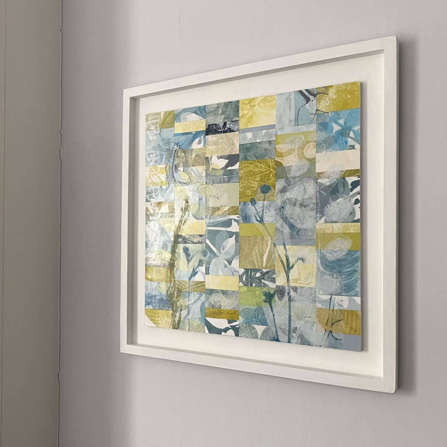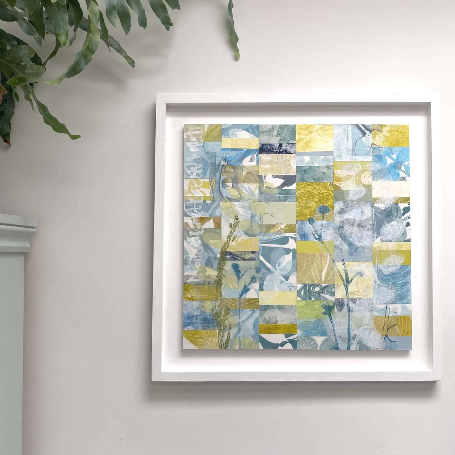 A unique combination of botanical mono prints on cartridge paper that have been collaged onto a plywood panels and framed in a hand painted tray frame. each piece is named and signed on the back.