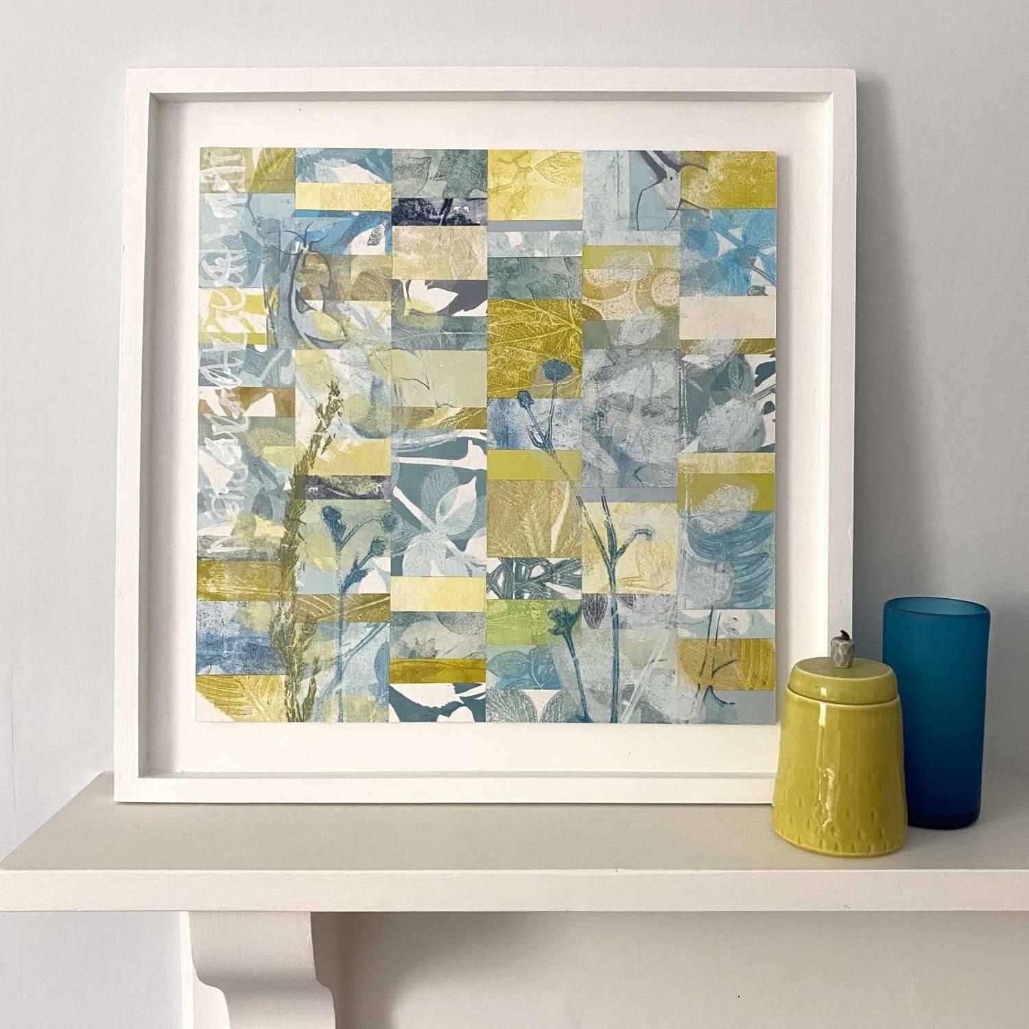The collage is 40cm square and the frame is 50cm square. The collage has been sealed and protected with a wax finish.