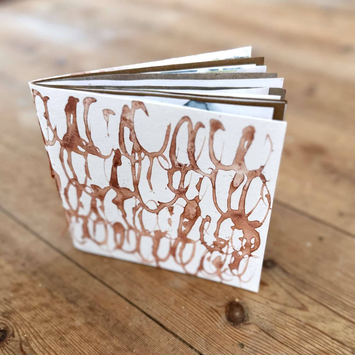 After making your cover with some inky design you will then compile your pages and construct your book using simple pamphlet stitch.